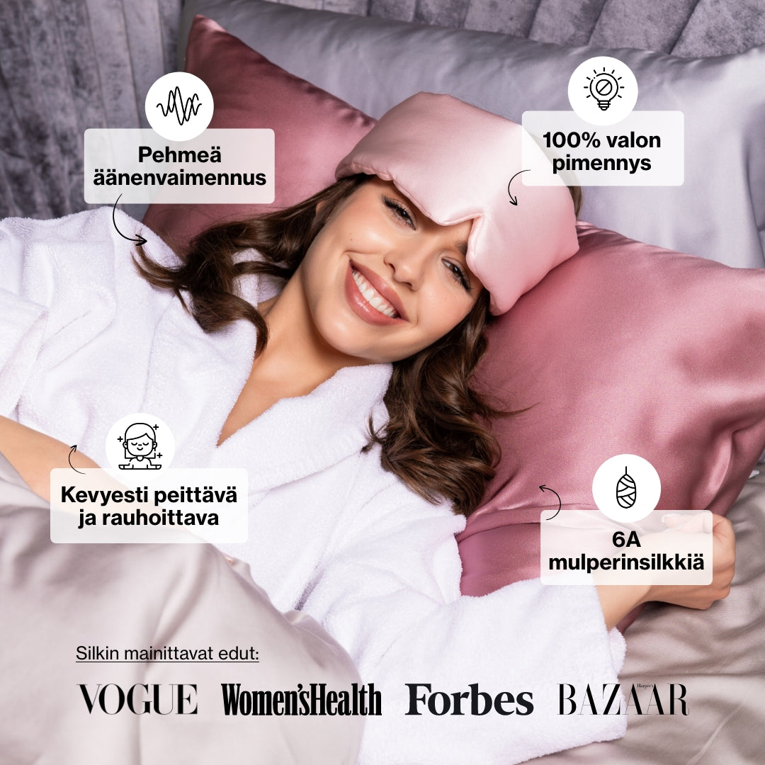 Suosittelemme pesupussin ja PH-neutraalin nestemäisen pesuaineen käyttöä. Käytä pesukoneessa hellävaraista ohjelmaa tai pese unimaski käsin. Kuivaa se ilmassa. Älä käytä kuivausrumpua, sillä se voi vahingoittaa materiaalia.