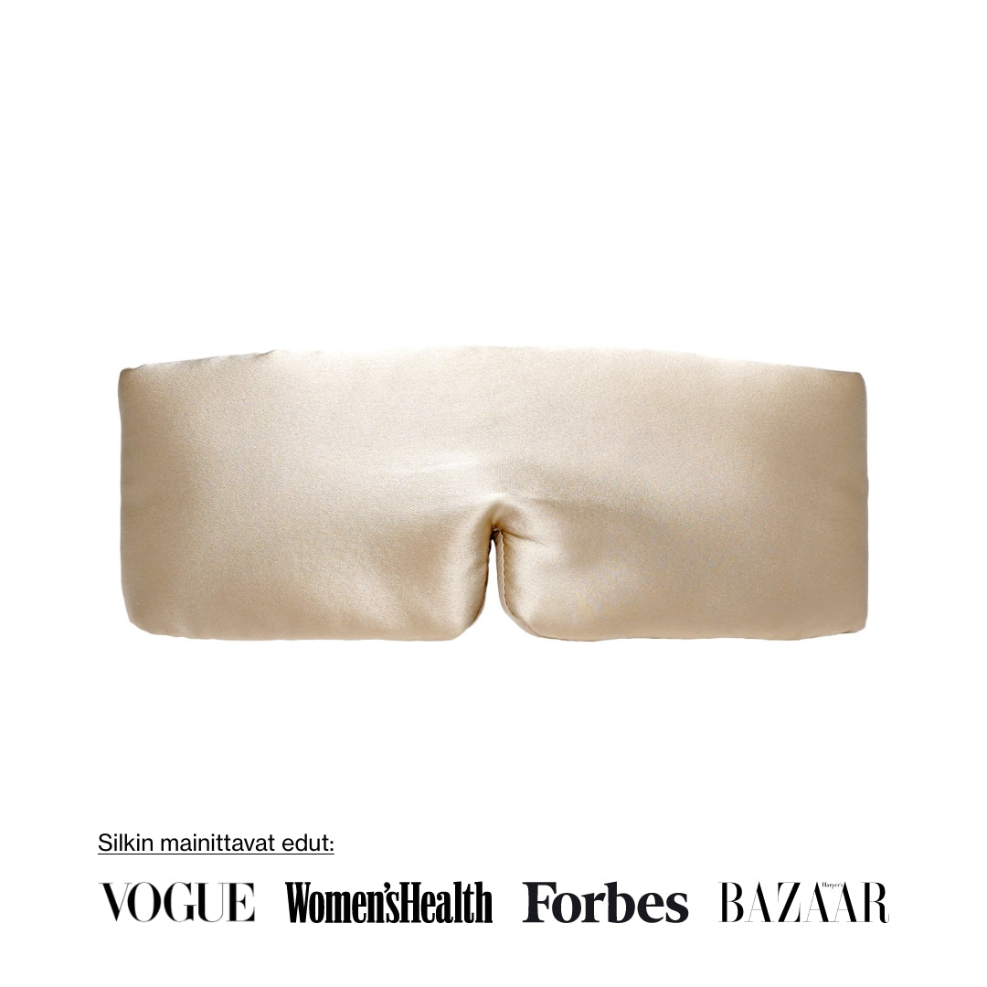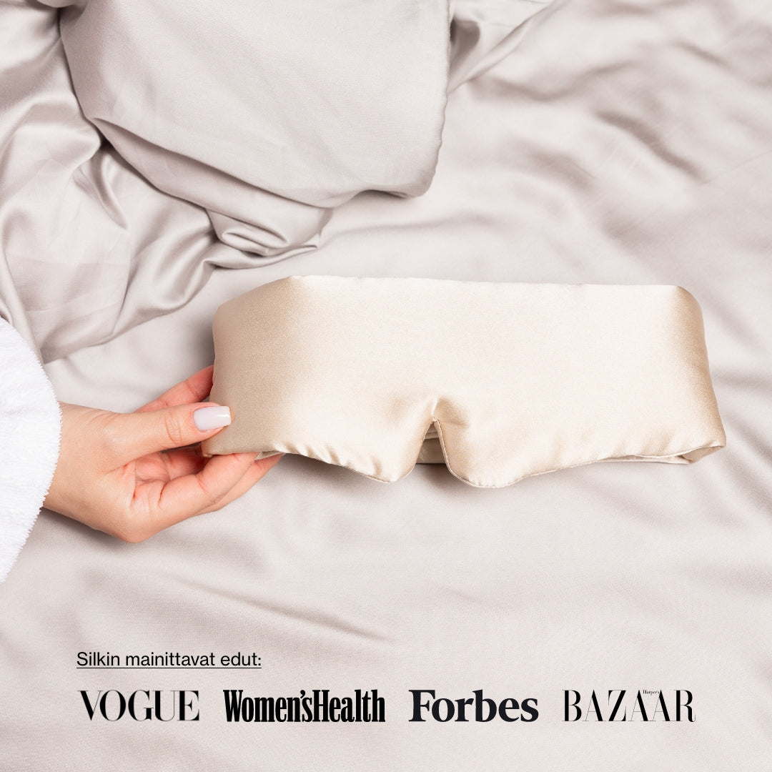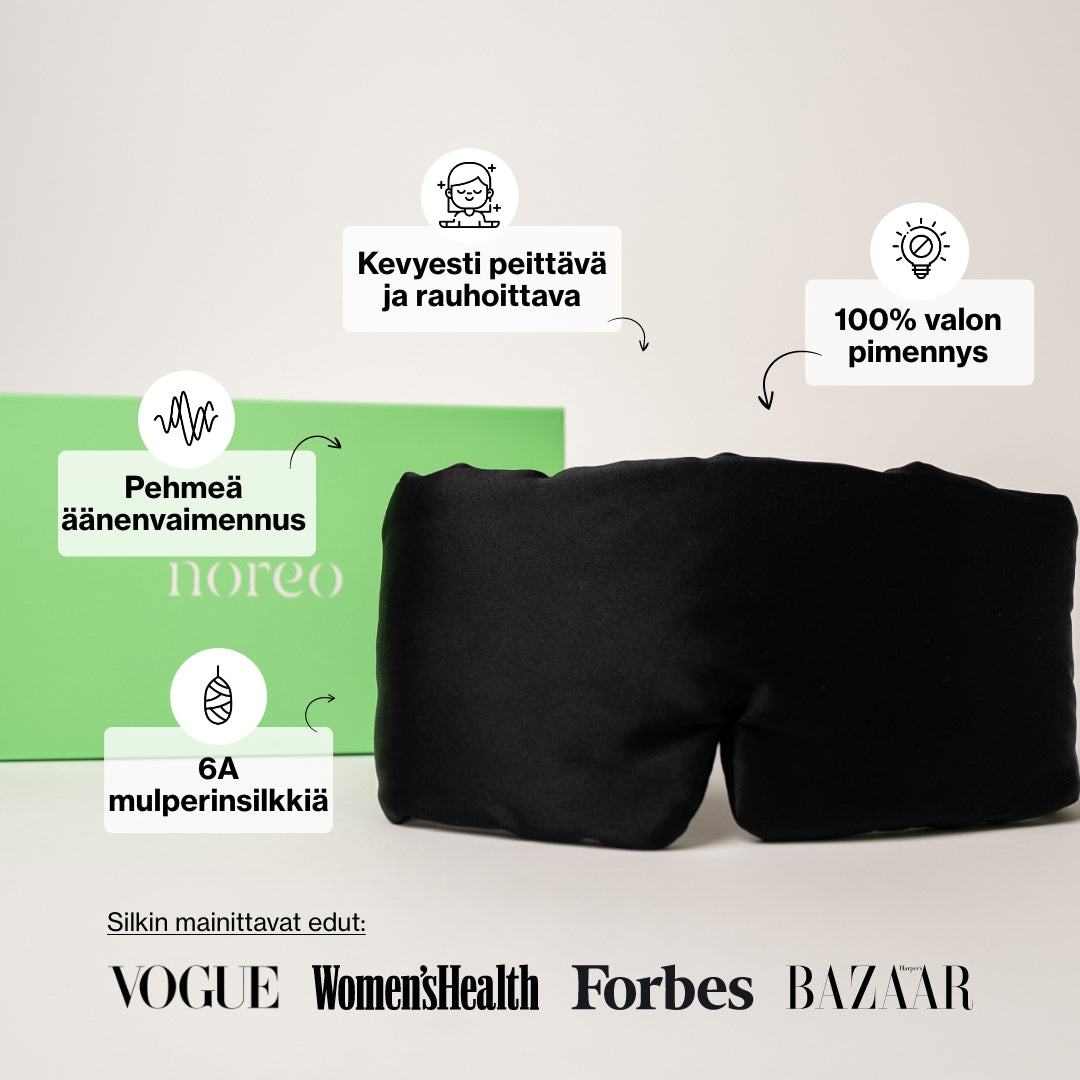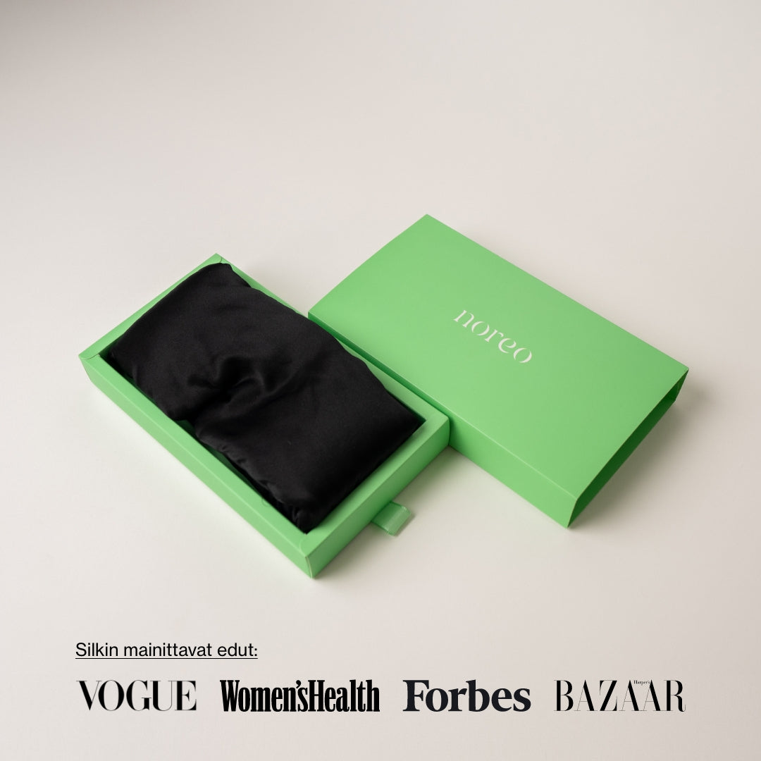 Noreon syvän unen maski on valmistettu 6A luonnollisesta mulperinsilkistä, kuten useimmat Noreo-tuotteet.