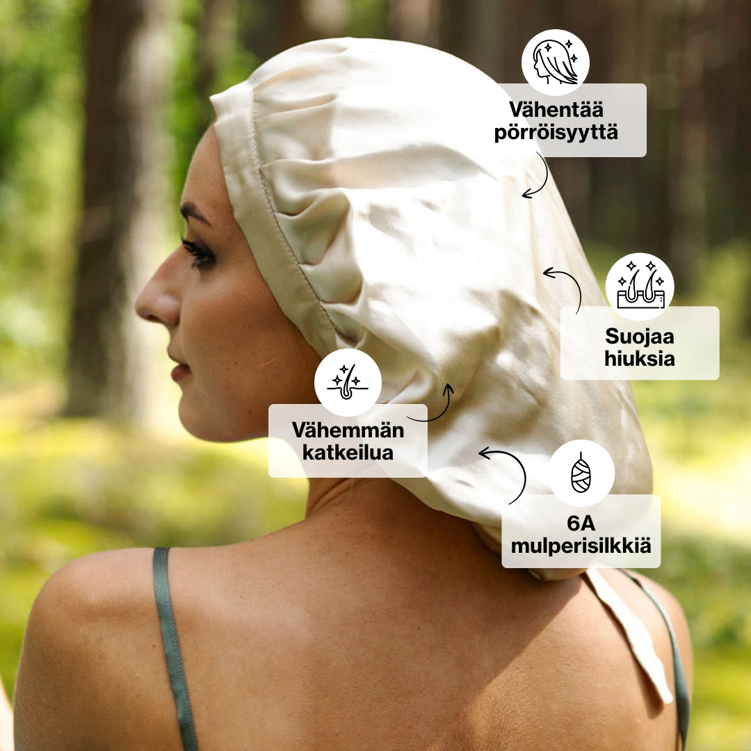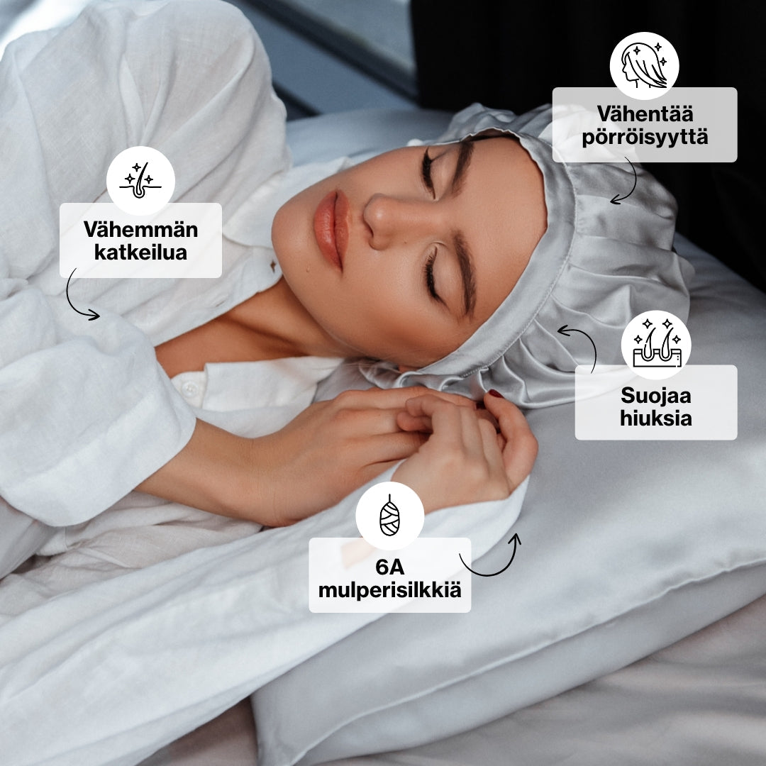 Pidä huoli hiuksistasi suojaamalla niitä tyynyn kitkalta. Tuotteiden parempi imeytyminen, vähemmän pörröisyyttä ja hyvä mieli aamulla.