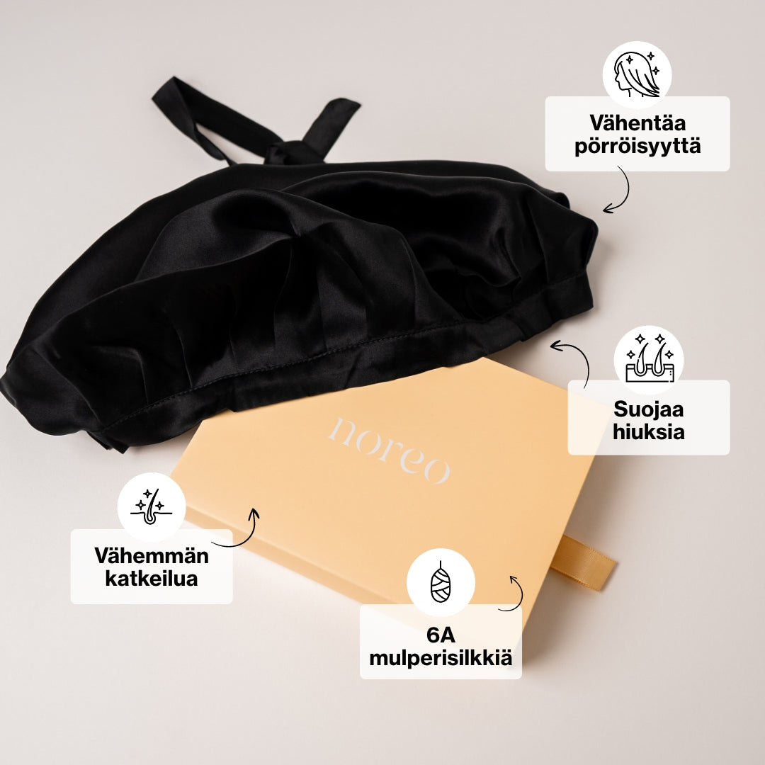 Noreon silkkinen myssy on ideaali valinta hiusten hoivaamiseen ja suojelemiseen. Toisin kuin nailon, puuvilla tai polyesteri, silkki on pehmeää ja vähentää kitkaa, mikä puolestaa vähentää hiusten katkeilua ja pörröisyyttä.
