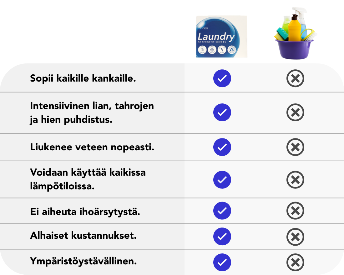 Liukenee nopeasti veteen ja poistaa lian, hien ja pinttyneet tahrat. Ei muovia tai haitallisia aineita.